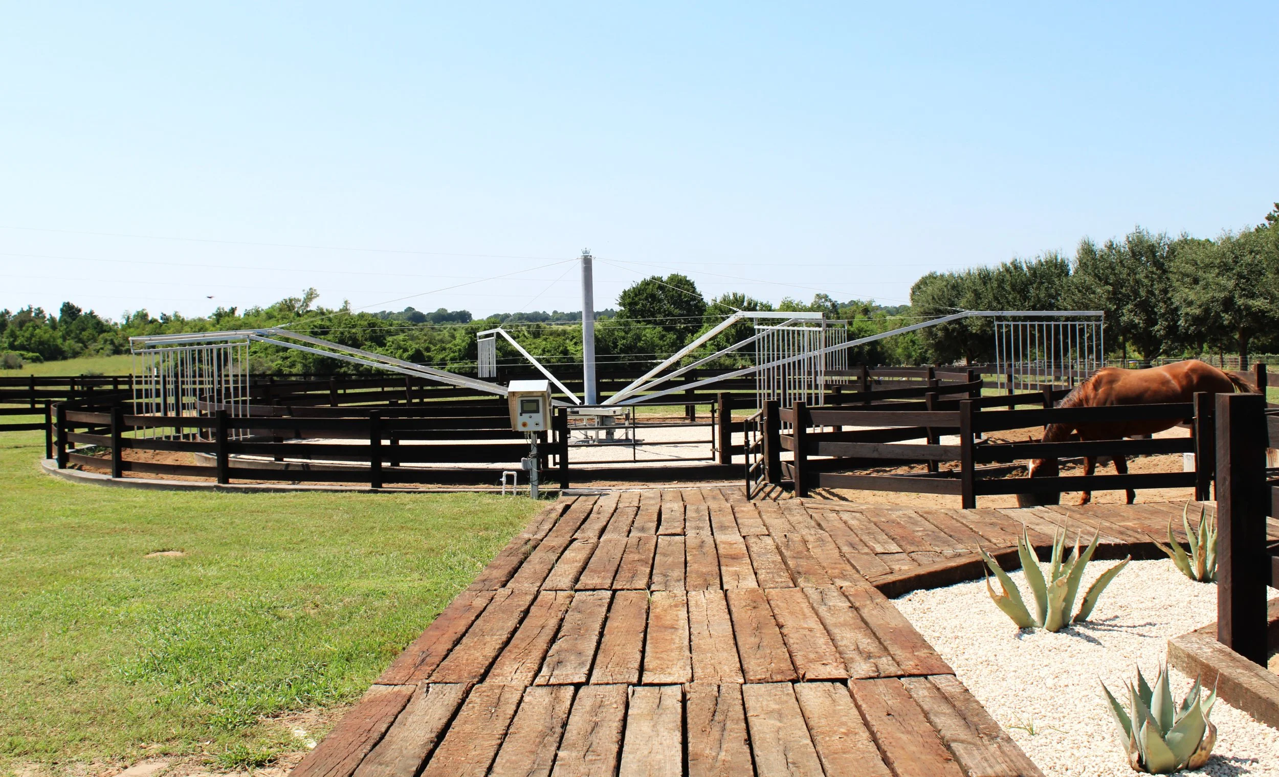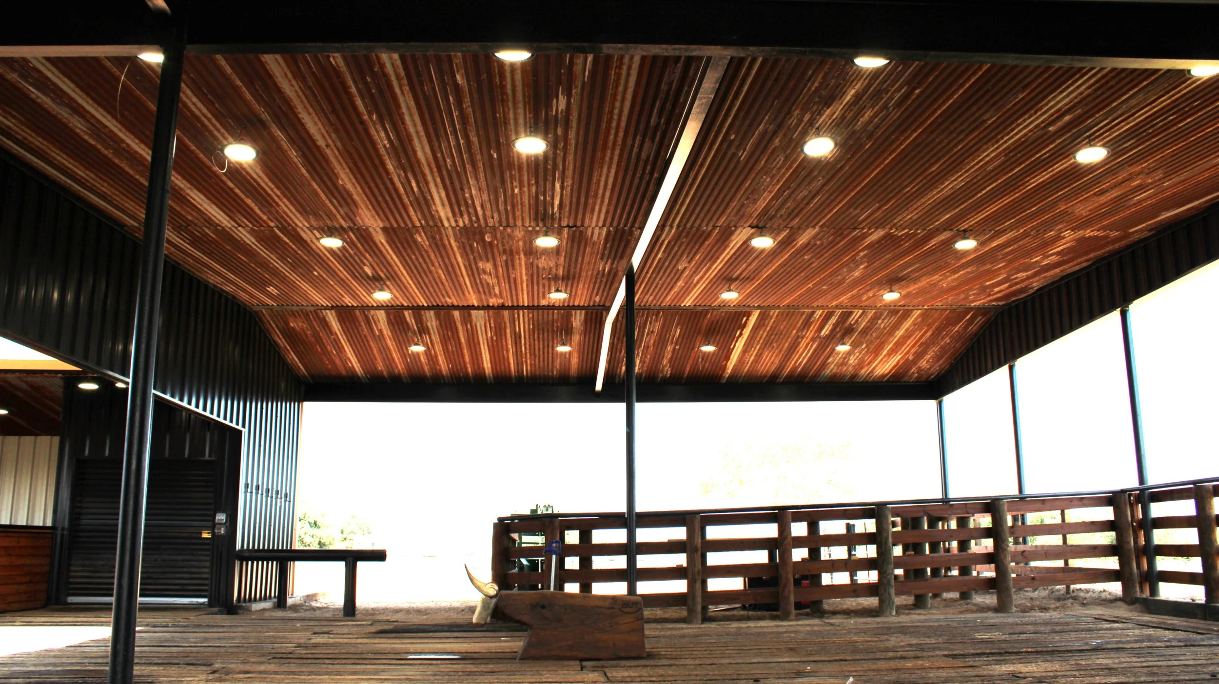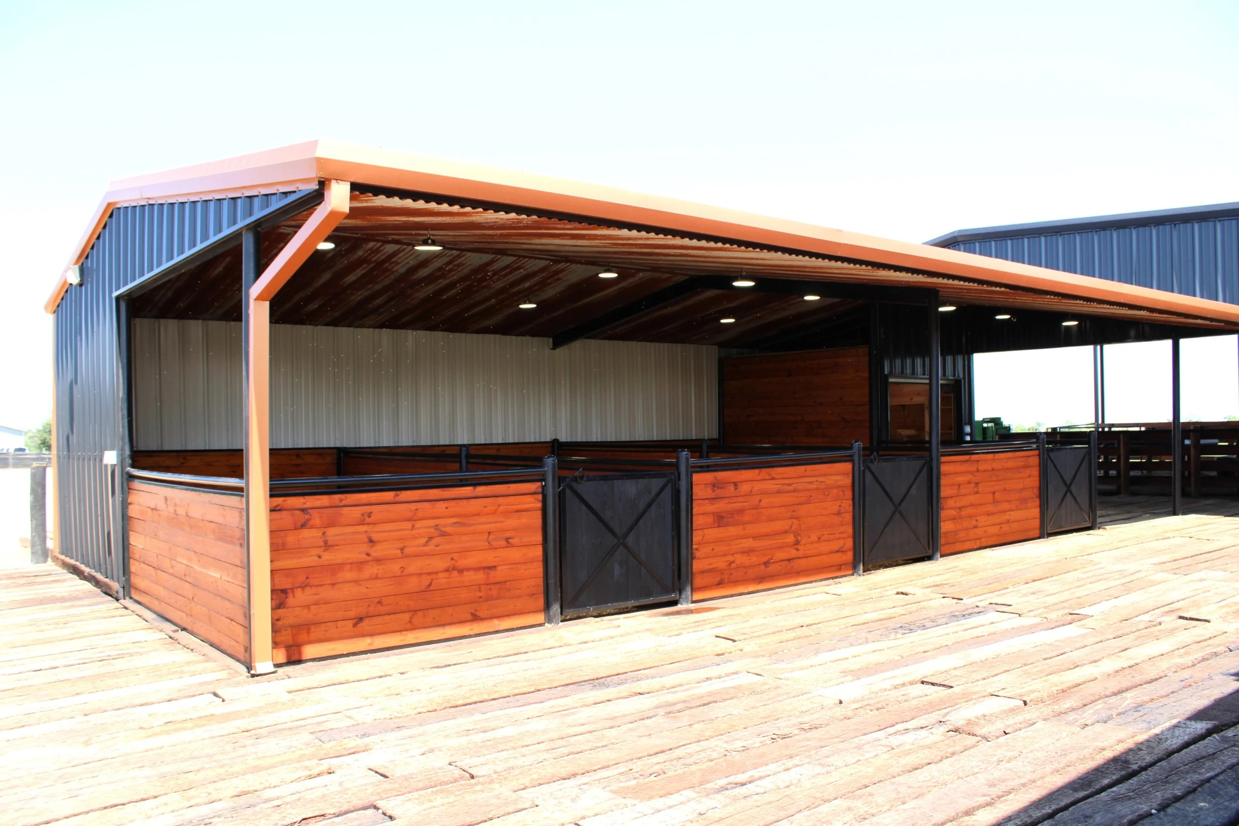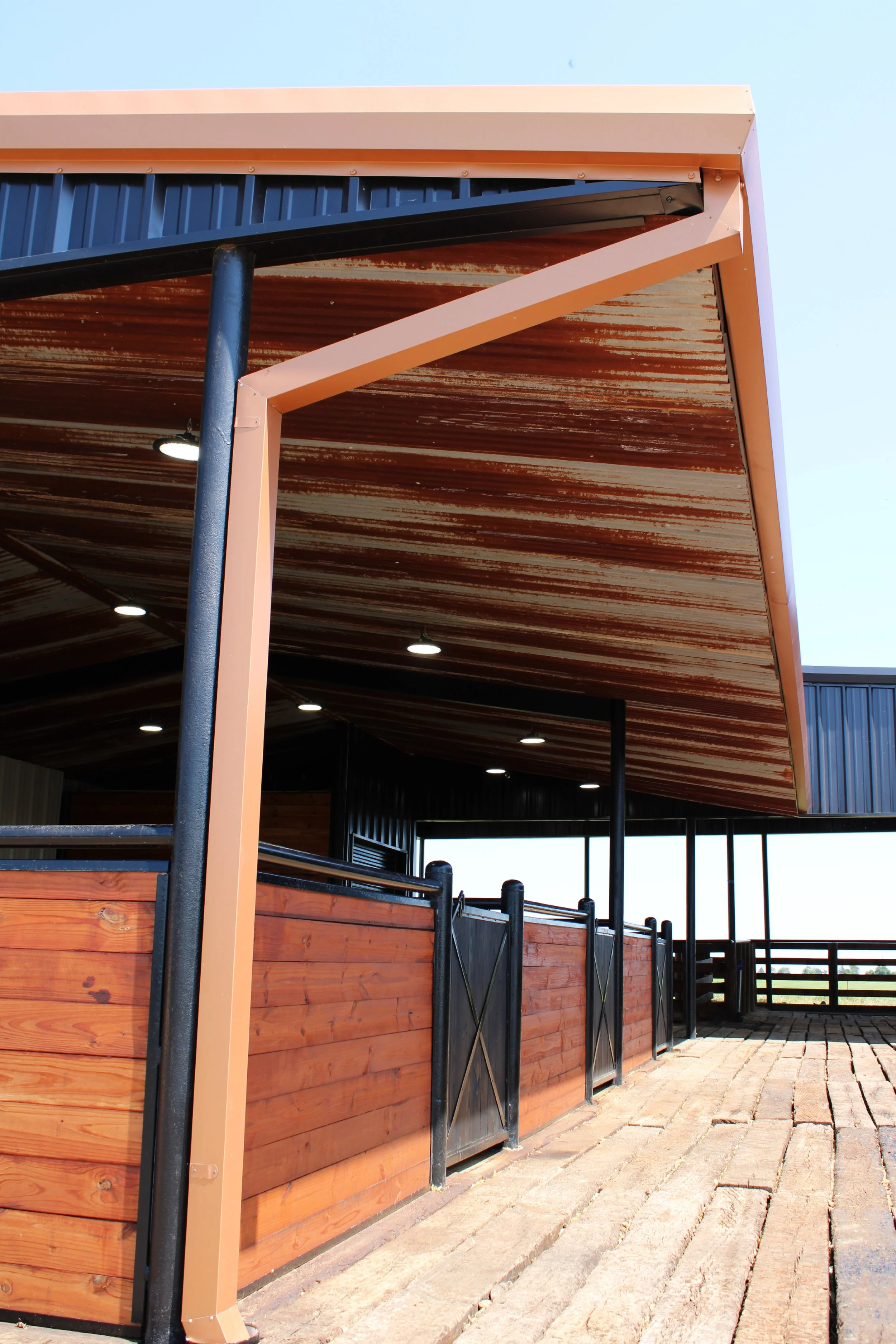 To maximize functionality, we also incorporated covered roping boxes and an open breezeway for smooth equine flow and ventilation. The layout allows easy access for feeding, tacking, and daily care while protecting equipment and vehicles from the Texas sun. We love incorporating unique details, like the antique sheet metal for the ceiling under the barn & covered roping boxes, that really personalizes our builds.